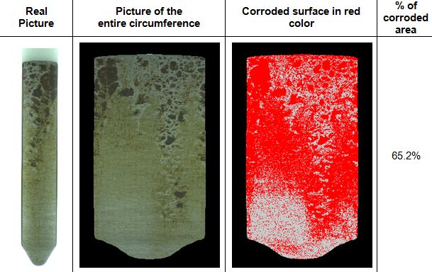 Operation is based on a homogeneous lighting source, CCD camera, specimen rotation system, and specially designed pplication software. Specific light is emitted onto the surface of the specimen. The specimen is rotated and several images are taken. The software builds a flat image of the specimen surface, calculates the percentage of the corroded area and then translates it into a NACE or ASTM rating. A detailed test report is ready in less than 5 minutes.